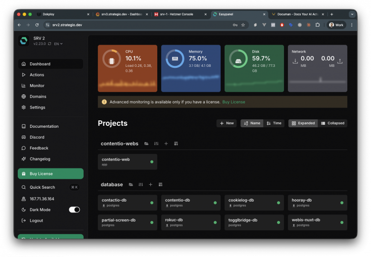 Nad touto infrastrukturou byl přibližně 4-5 let používán Easypanel s placenou licencí, která umožňovala primitivní monitoring a zálohování databází do vlastních AWS S3 úložišť. Setup byl dlouhodobě funkční a odpovídal potřebám provozu.